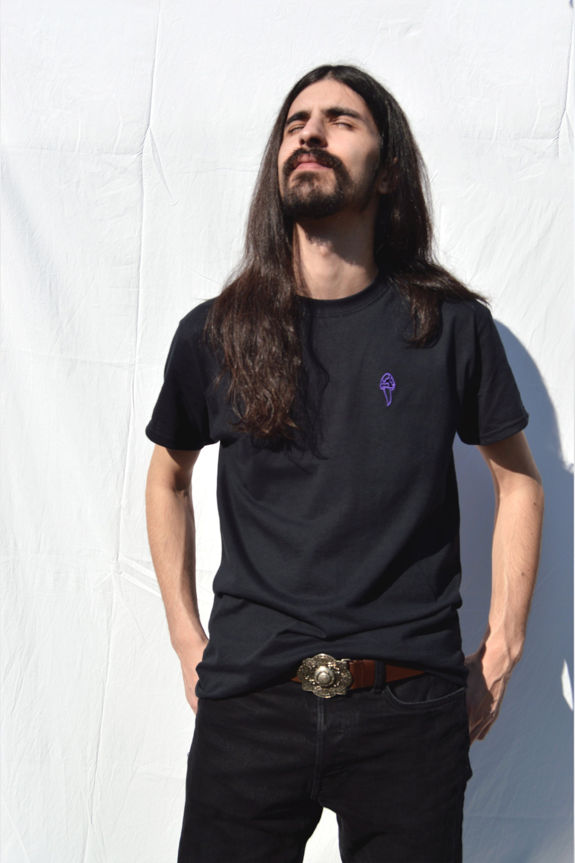 The "FUZZ LOVERS" is your new favorite black standard fit tee. Embroidered mushroom on the chest front and screen printed logo on the back. Available in black with purple haze print.