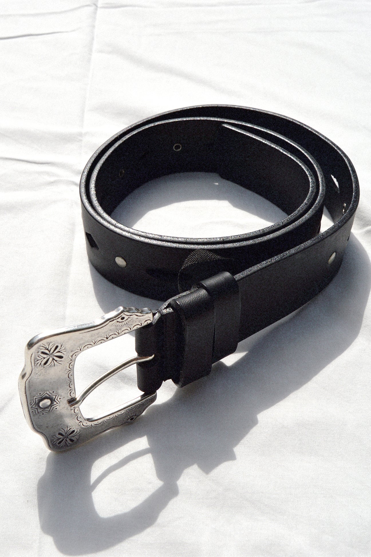 The "Happy Trails" is the coolest western-style genuine leather belt inspired by Western Spaghetti movies and soundtracks. Silver color cowboy buckle. Available in black and vintage brown. Handcrafted in Portugal. Suitable for men and women.