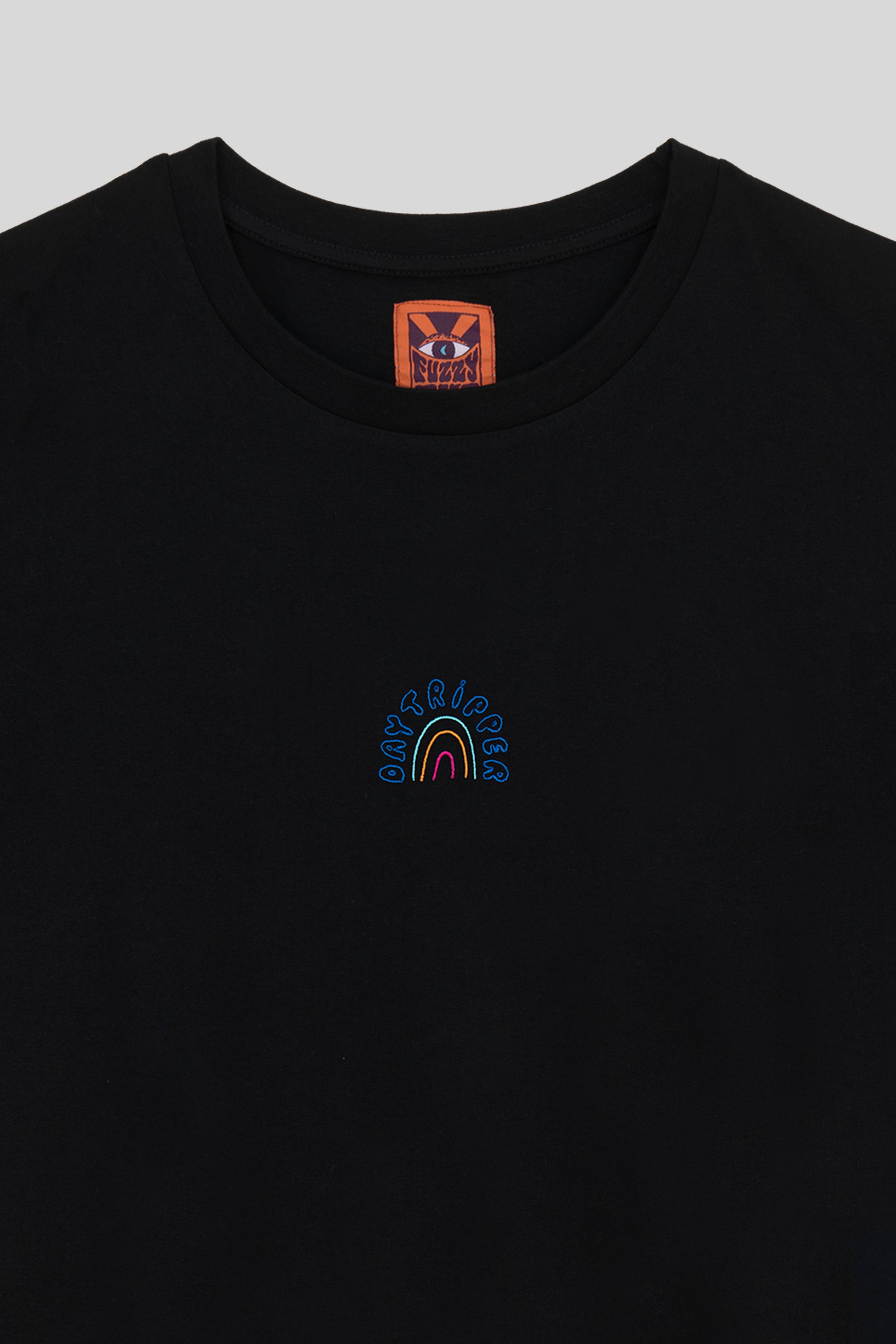 The "RAINBOW" is a standard fit tee. Embroidered rainbow on the chest front inspired by "Day Tripper" from The Beatles. Available in black.