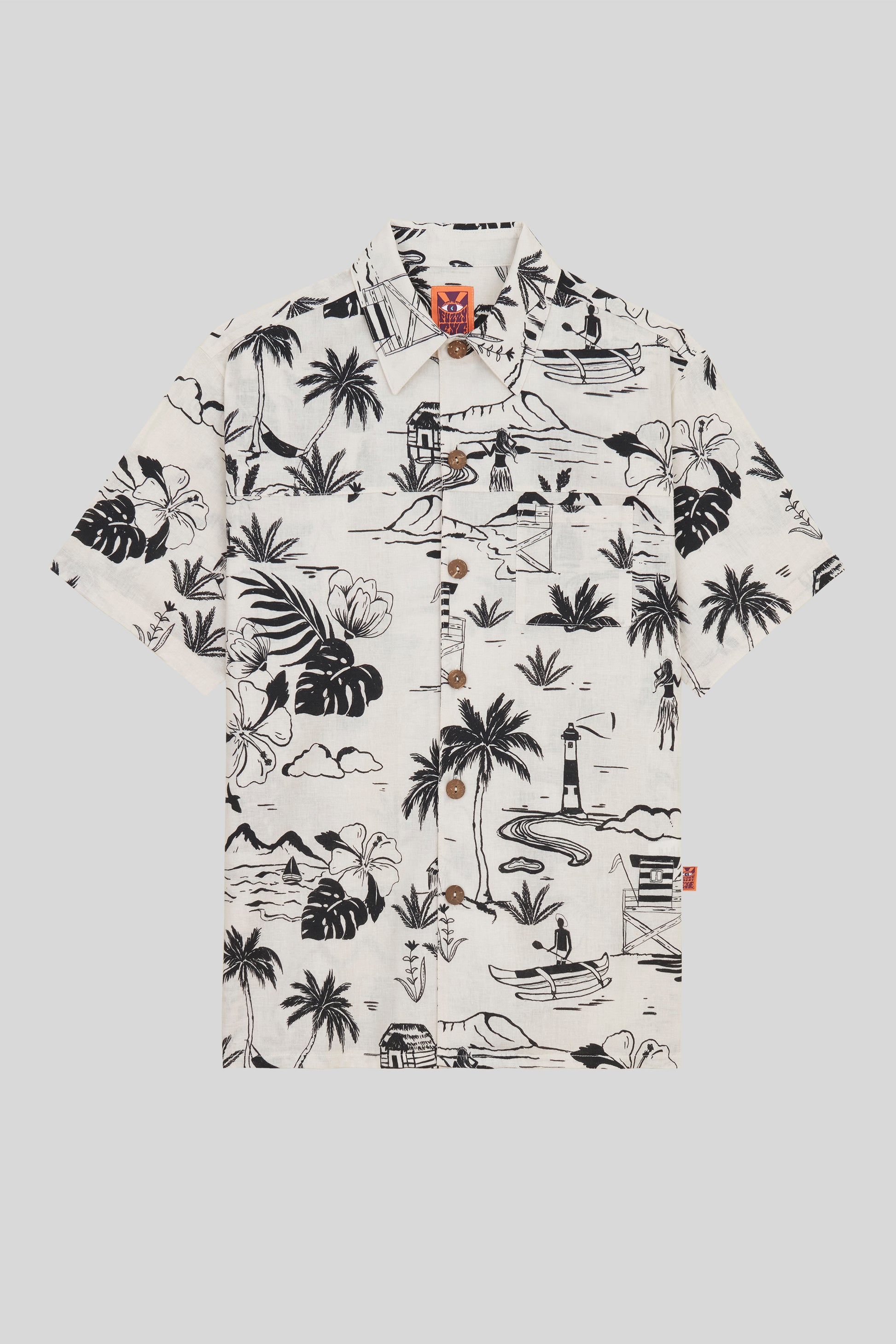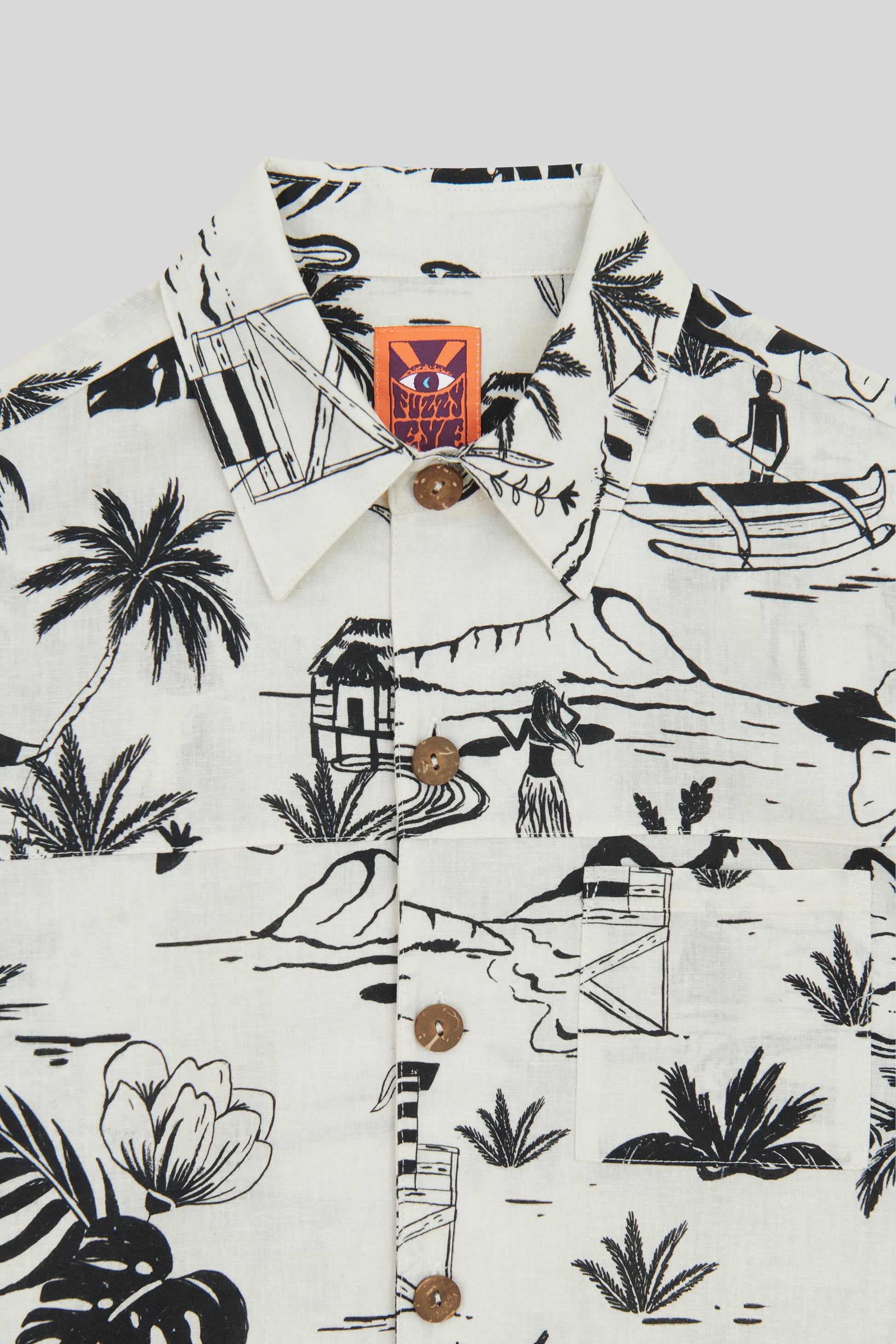 The "SURFER JOE" is the coolest regular fit short sleeve shirt, perfect for an after surfing beer sunset or a summer festival hangout. Features a pocket on the chest front, coconut buttons and designed with 70's inspired collar. Available in surfer joe black & white pattern. Limited edition.
